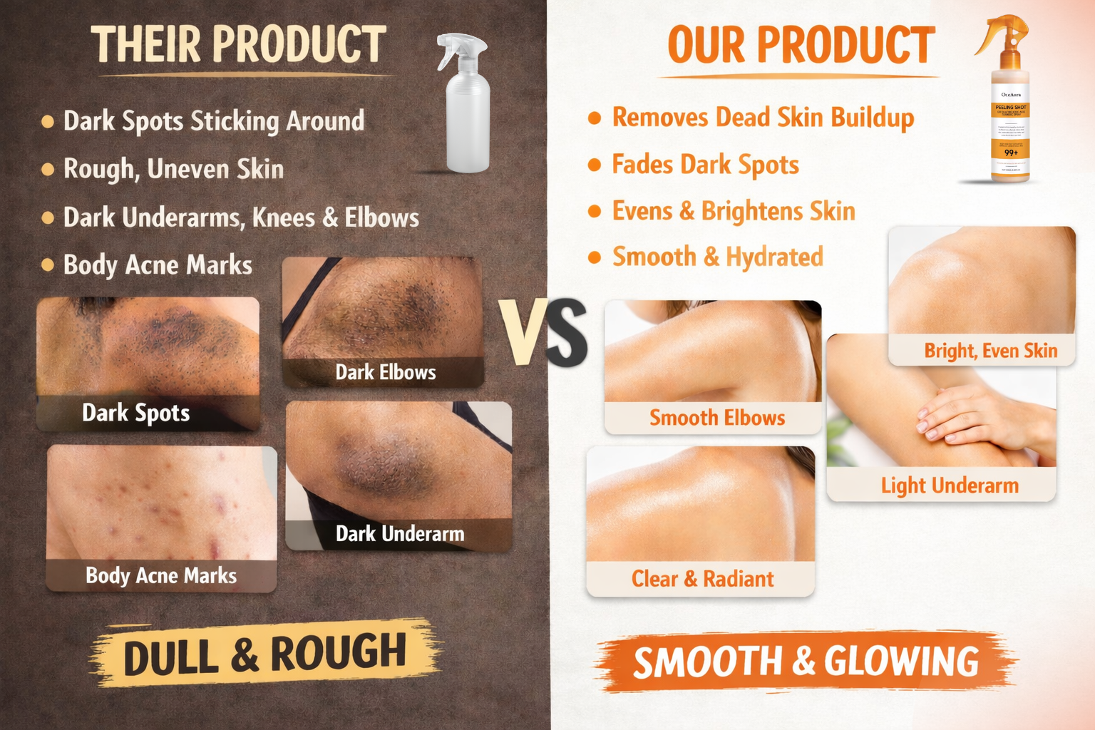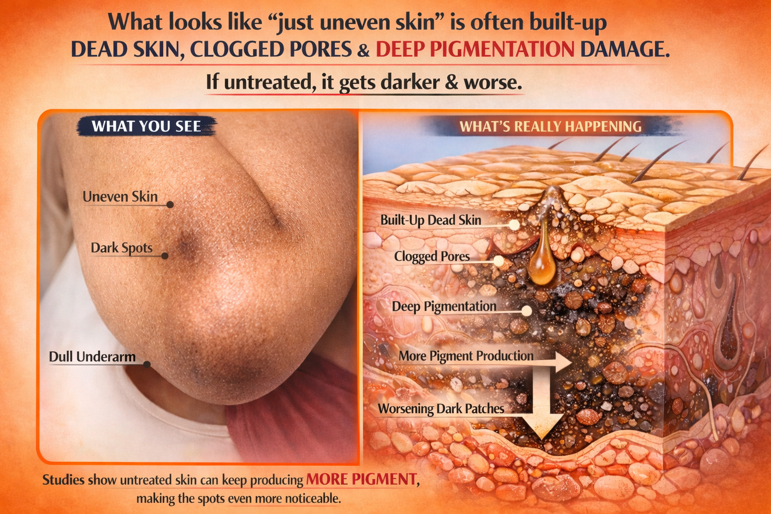 You use basic lotions or random products that don’t exfoliate deeply enough. So the dead skin stays. The pigmentation stays trapped.